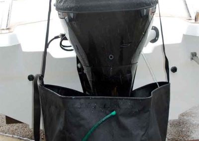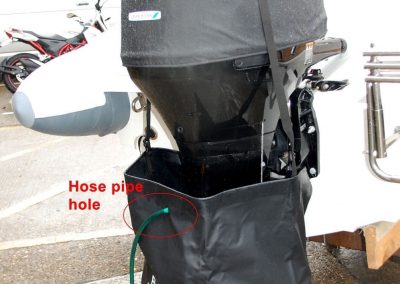Place the flush bag CAREFULLY under the skeg & then attach the “guide strap” which goes over the top of the cowling. Fill with water to cover over water intakes, start your motor and it will flush out salt. Obviously, you cannot put the motor into gear as the prop will cut the bag! You should never allow the “guide strap” to take the weight of the water as it could damage your cowling/outboard due to the weight of the water:- 1 gallon of water = 8.3 Pounds (roughly). Once flushing is complete undo the drain plug in the flush bag to empty the water out.